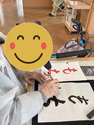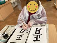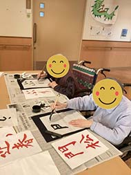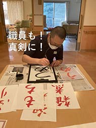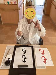 お正月、恒例の書初めも服が汚れないよう準備万端で皆様、真剣に行ってくれました!